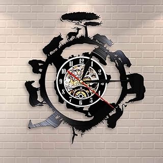TIANZly Africain Animaux Sauvages Paysage Jungle Animaux Disque Vinyle Horloge Murale Afrique Coucher De Soleil Mur Décor Vintage Silencieux Quartz Horloge Murale