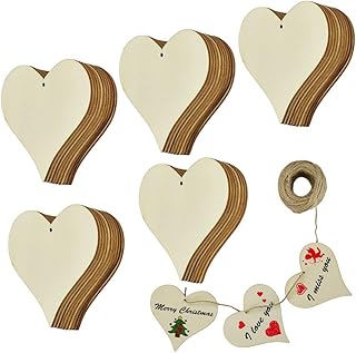 KLYNGTSK 50 PCS Coeur en Bois Décoration avec Corde Coeur en Bois à Suspendre 8*8cm Tranches de Bois de Cœur en Bois à Peindre Tranches de Coeur Embellissement pour Arbre de Noël, Mariage, Artisanat